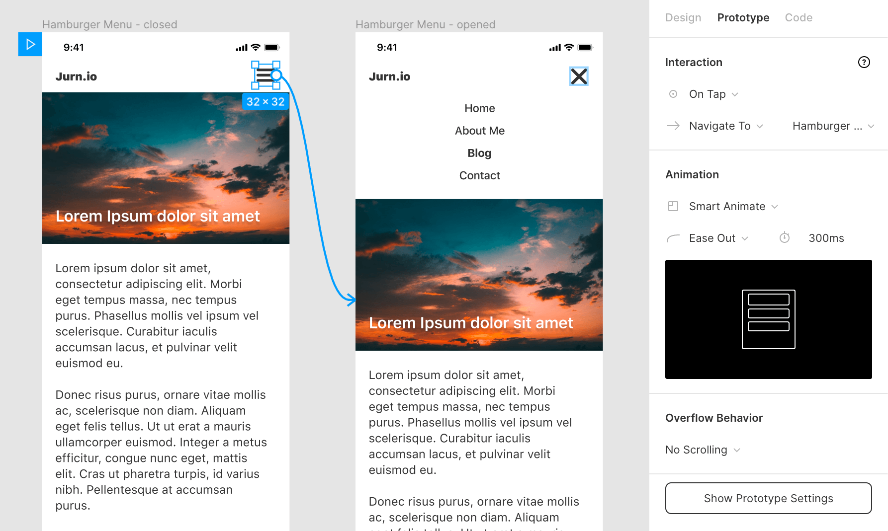 This simple animation opens a hamburger menu. You can see that the hamburger icon has an On Tap trigger, once it is triggered it will Navigate To the screen where the mobile menu is in an opened state. The transition type is a Smart Animate transition which means Figma automatically interpolates between these two states. It does this using an Ease Out animation function with a duration of 300ms.