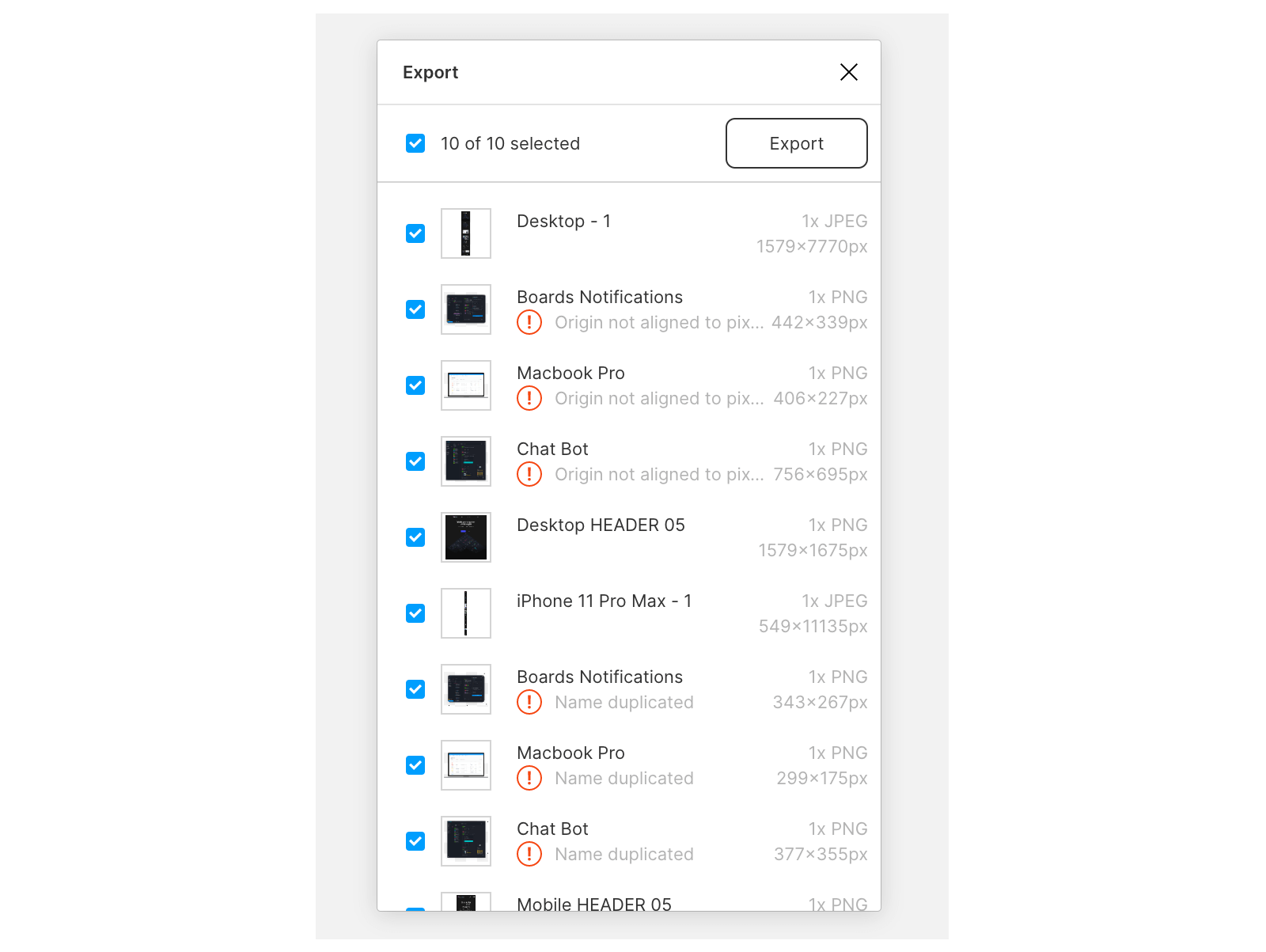 This will display a list of all the items in the file that are marked for export. You can then inspect the dimensions, file type and exclude any files before making the final export. If you hover over the thumbnail of the assets it will display the file name that the asset will have when it’s exported.