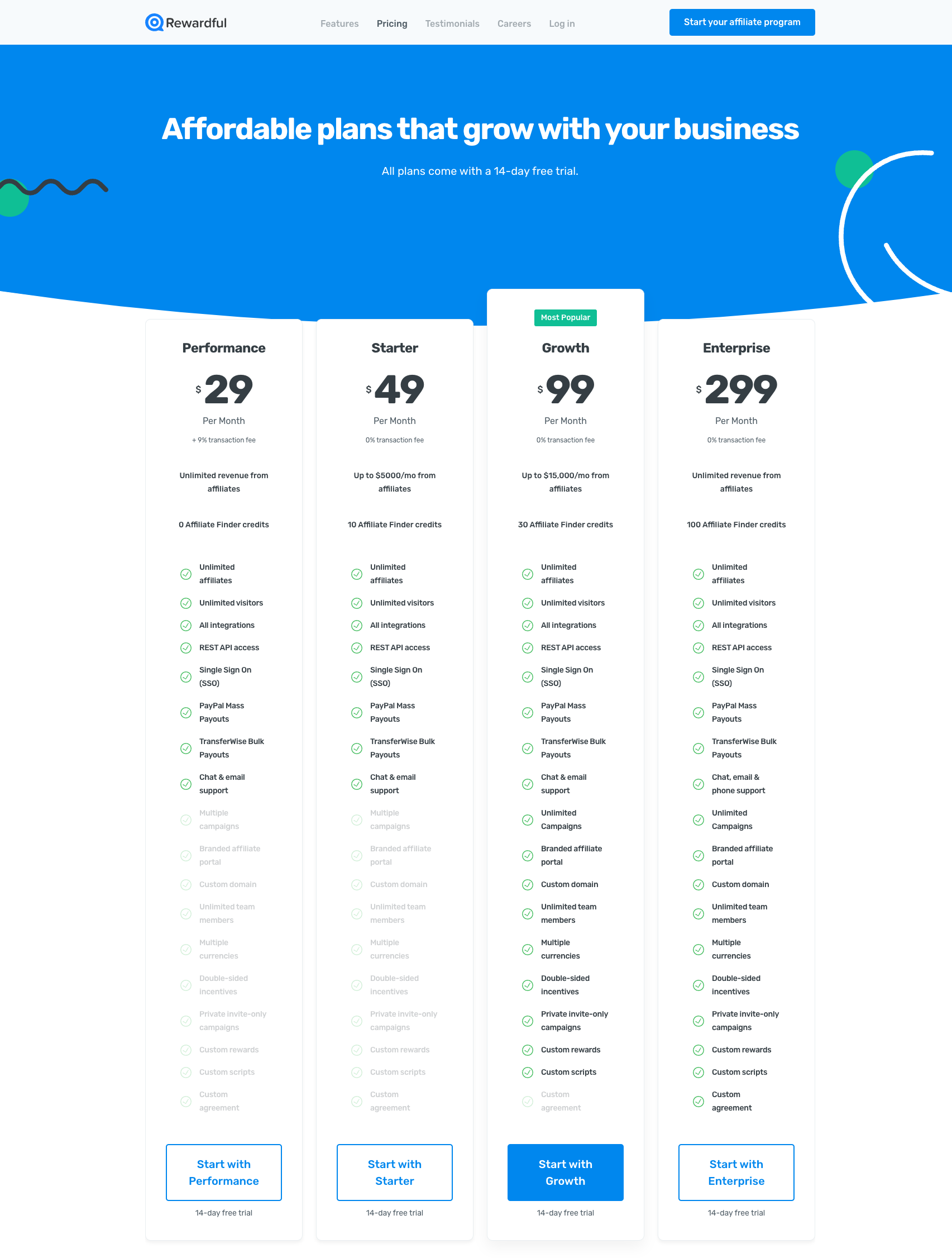 Let's walk through a purchasing scenario together and see why the trial is pretty much useless. Let's say I'm a growth marketeer at a medium-sized SaaS company who wants to launch an affiliate program using Rewardful. I need to install it on a custom domain so I'll start on the Growth tier with a 14-day trial.